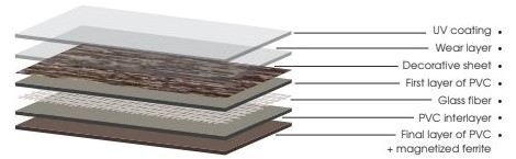 Easy installation of this reusable Magnetic Flooring System on a ferrous foil which is laid loose on the subfloor and where the floor covering with its magnetic back coating is simply laid on it, without any click or key and slot joints. Create a totally new style in your premises with a very short time! Being very easy to install, the unique MABOS® system enables flexible and economical changes and is therefore ideal for all areas where quick installation is a must. Specifically for high traffic application in the commercial sector such as hotels, exhibition stands, shops, fitness centers, offices, shopping centers as well as hospitals and medical studios, this high-value and sustainable PVC Design flooring is successfully used worldwide – wherever highest demand and resistance are required and where functionally and durability meet extravagance. Discover the wide range of benefits and unlimited possibilities of this collection with its various stone and wood design and dimensions.